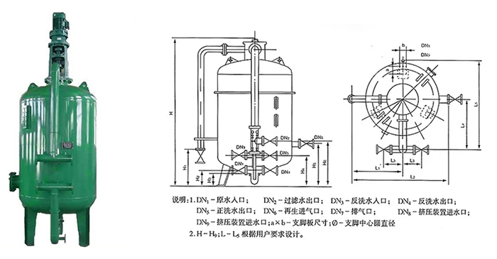 結(jié)構(gòu)簡單:主要由以下部分構(gòu)成:配套管線和閥門,其中過濾器體又包括:筒體、反洗氣管、布水組件、支撐組件、濾料、排氣閥(外置)等